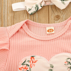 Dress your little fashionista up as chic and stylish as you are all while keeping her comfortably snug with this Pink Floral Heart Romper Set. The set comes with an adorable ribbed romper with floral accents, featuring a classic O-neck cut, ruffled sleeves and a standard crotch opening with covered buttons for closure type. It also comes with a floral elastic waistband pair of shorts with a matching floral head bow.