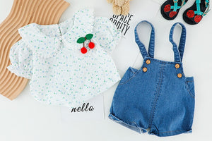 Why choose between fashion and comfort when you can have both with this Delilah Cherry set! Opt for the best when it comes to your little one and get a perfect mix of style and comfort with the Delilah Cherry set. It features a chic floral blouse with a round lace collar with a classic denim jumper with a cute cherry on top!