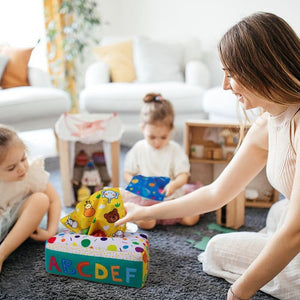 The Sensory Tissue Box is an innovative plush toy that engages young children and toddler in play and development. The crinkled tissues and tissue box comes in vibrant colors and is made of different child-safe materials, with varying textures to stimulate your child's senses. Watch as the little ones, develop their fine motor and problem solving skills, putting and pulling the cloth tissues out of the box.