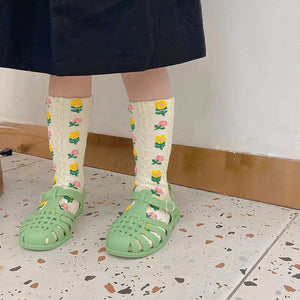 Keep your little toddler's feet warm and cozy and snag a pair of the Floral Plaid Stockings. These socks provide a calming pressure sensation and are crafted with high-quality knitted fabric. It features a unique cottage-core inspired design, making them both a one-of-a-kind fashion piece and practical clothing perfect for your child.