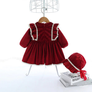 The Red Velvet Dress set features an adorable red dress and a day cap, letting your child go back in time, playing out their little fairy tale stories.
