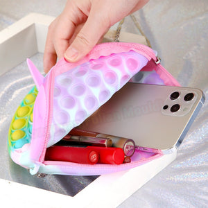 What better way to own a fidget toy than have one that serves two purpose in one, much like the Pop-it Unicorn Purse. This purse is made with quality and durable silicon material. It features a classic zipper with a long chain strap and a unique rainbow unicorn-inspired design that is adored by both kids and adults alike.